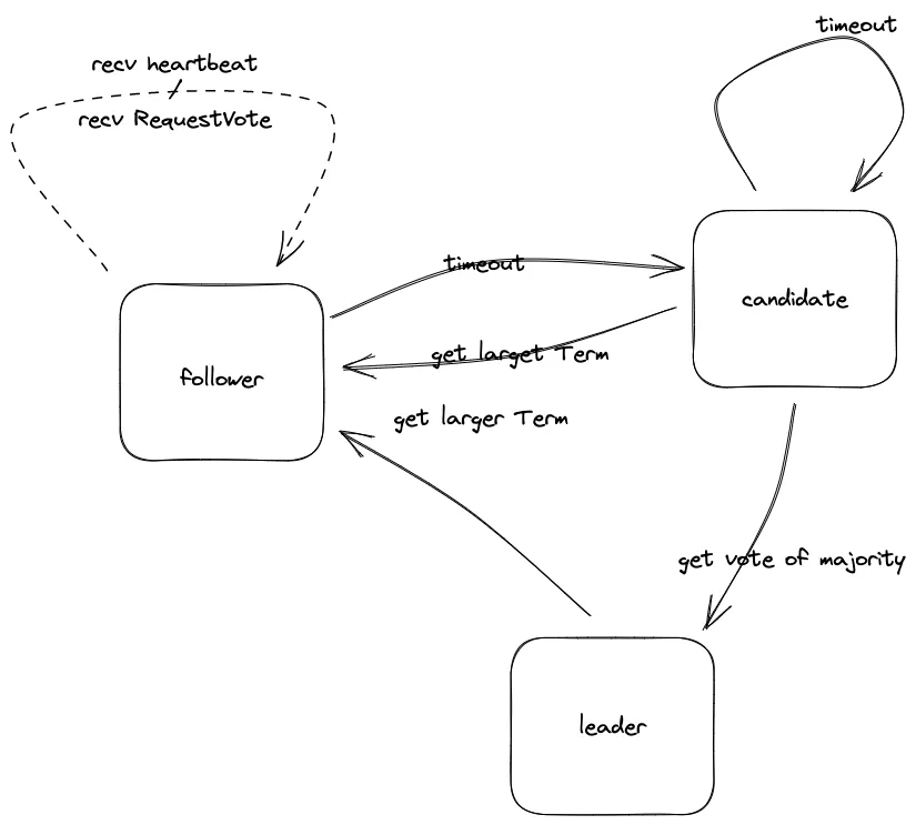 switch-case.func (s State) to(t State) int { return int(s | t<<__nState) } switch oldState.to(newState) { case Follower.to(Candidate): /* ... */ case Candidate.to(Candidate): /* ... */ /* ... */ }In Figure 4 of the paper, 5 edges are defined. For convinience, I add