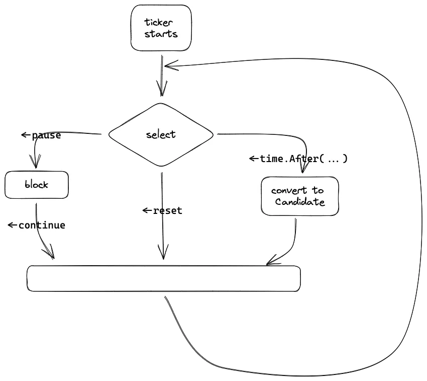 reset,pauseandcontinue. It loops to select a random timeout,resetsignal orpausesignal. For (1)timeout, it converts to candidate (which starts a election); for (2)reset, it restarts a loop; for (3)pause, it blocks to wait for another signal fromcontinue.